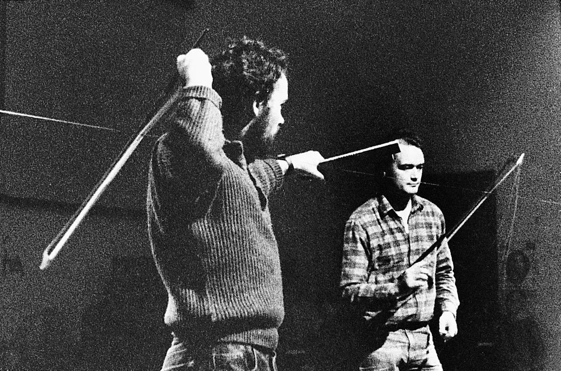 Swiss musicians Andy Guhl and Norbert Möslang formed the duo Voice Crack in 1972, originally performing entirely acoustic improvisation on reed instruments and percussion, then gradually incorporating electronics into their performances until they were eventually performing electronics exclusively. Voice Crack uses the phrase “cracked everyday electronics” to describe their constantly shifting and growing instrumental resources: familiar sound-making devices such as turntables, tape machines, and radios; piezo contact microphones; long wires strung across rooms and played with violin bows and sticks.